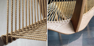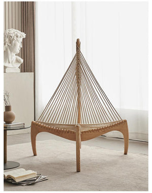 The "Sail" chair is a homage to the Harp chair by the illustrious designer Jørgen Høvelskov. The Sail features a robust structure made from solid natural ash wood, paired with a seat and back crafted from natural rope. Drawing inspiration from the graceful arcs of a Viking ship's bow and stern.