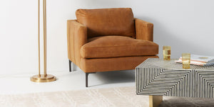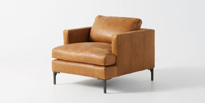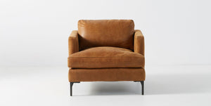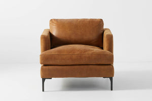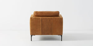 Experience the epitome of modern minimalist decor with the Hudson leather armchair. Its t-shaped deep and luxuriously comfortable seat and back cushions create a relaxing respite that effortlessly complements contemporary living spaces with a mid century feel.