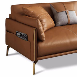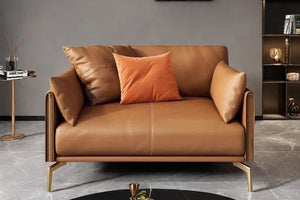 The Isabella Modern Leather Armchair, with its luxurious leather, contrasting stitching, and gold copper legs, embodies elegance and comfort. Its striking design features plush cushions and a sleek silhouette, making it a sophisticated addition to any space. The contrasting stitching and metallic legs add a touch of modern luxury, ensuring it stands out as a statement piece in your home.