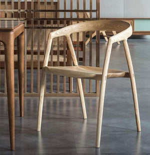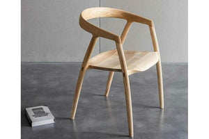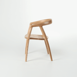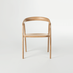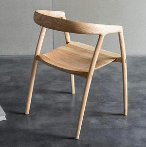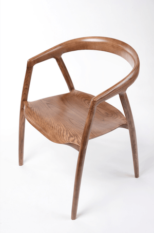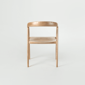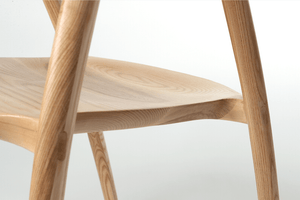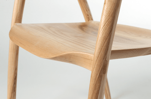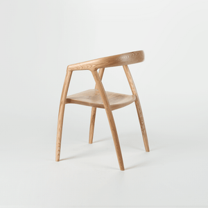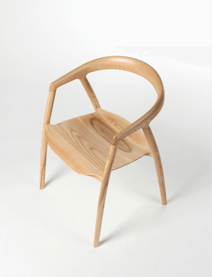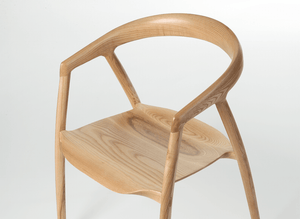 Meticulously handcrafted from solid ash, it showcases a curved back, a contoured seat, and distinctive raked legs. The sculptural design seamlessly balances positive and negative space, creating a dynamic interplay that captures the eye.