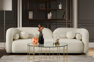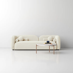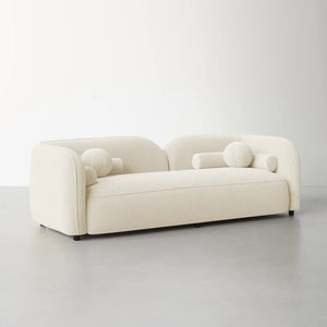 The Ferrucci sofa stands out with its inviting curves, bold proportions, and a sculptural split backrest, drawing inspiration from the refined simplicity of Japandi style. Built with a solid eucalyptus wood frame, it is wrapped in soft, textured boucle fabric (other fabrics and leather available) that adds warmth and sophistication. Two bolster pillows and two spherical cushions complete the design, offering a unique and comfortable touch to this contemporary piece.