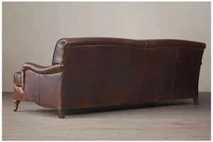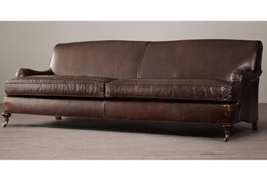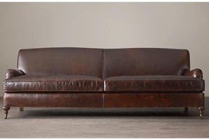 Paying tribute to the luxury and comfort of Edwardian-era furnishings, our Harrow Leather Sofa is marked by its handsome double arched back, low rolled arms, and turned front legs on brass casters. The deep profile and loose seat cushions give it a relaxed feel, while still exuding an air of timeless elegance.