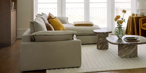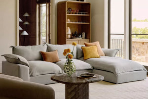 The Chiara Modular Sofa With Chaise showcases cushions with a foam core encased in a luxurious, ultra-soft down alternative (feather also available). Its deep seats are crafted for unparalleled comfort, while each piece is accented with an elegant flange edge.