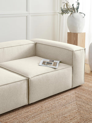 Our modular sofa series Russo, available in various sizes and components, creates the perfect sanctuary for cosy moments at home. Its signature design—featuring low arm and back supports and a plush, deep seating area—is ideal for lounging and relaxation. The solid pine wood frame is built for longevity, while integrated foam cushions with pocket springs maintain its distinctive form. An easy click system allows for effortless expansion.