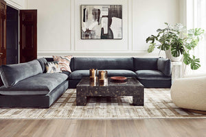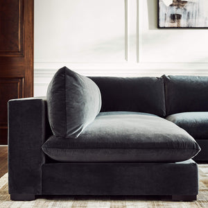The Venturi sectional corner, upholstered in luxurious performance velvet, combines modern elegance with inviting comfort. Its expansive design sits low to the ground, showcasing a plush silhouette with pillow-like detached cushions and wide armrests that double as casual seating spots for gatherings. Customise the layout with modular pieces to perfectly suit your space.