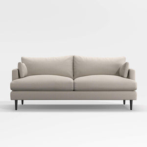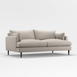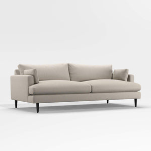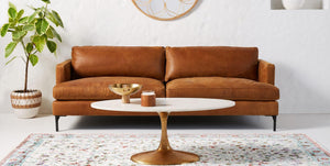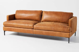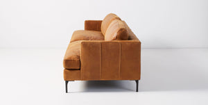 Experience the epitome of modern minimalist decor with the Hudson leather sofa. Its t-shaped deep and luxuriously comfortable seat and back cushions create a relaxing respite that effortlessly complements contemporary living spaces with a mid century feel.