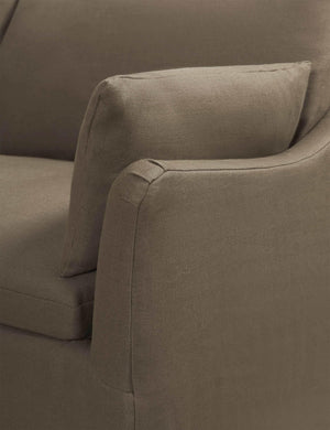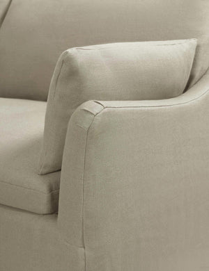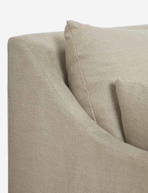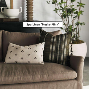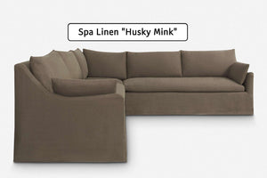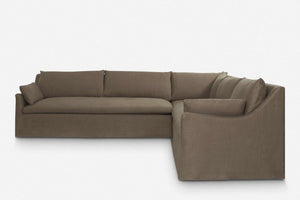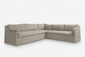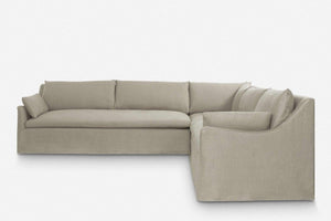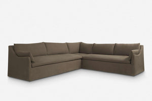 Corner version of the Lilly Sofa. Beautiful slope arms and a clean style make this sofa a must have for every living room. Feather or fibre wrapped cushions give it superior comfort, while the slim arms ensure maximum seating space. Available in linen, cotton and velvet.