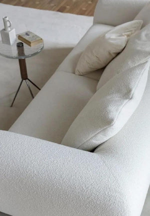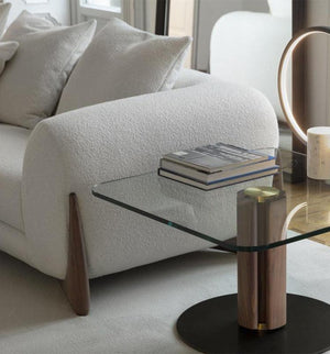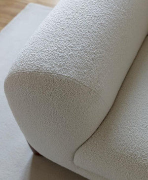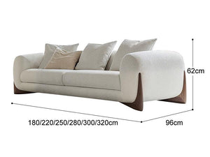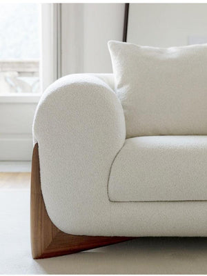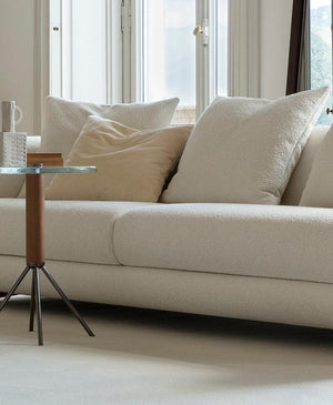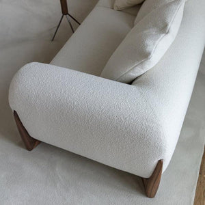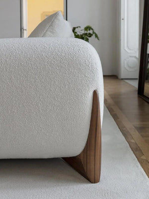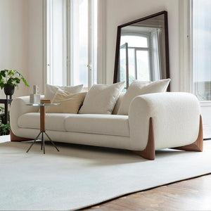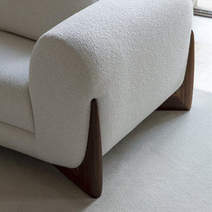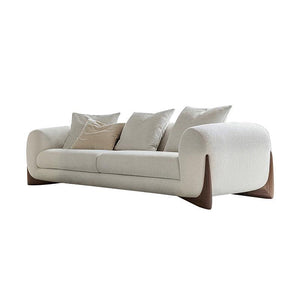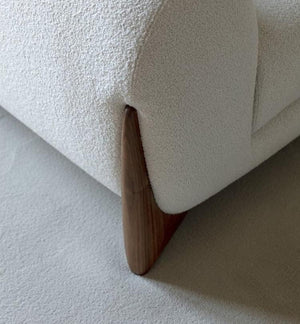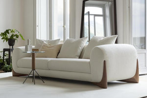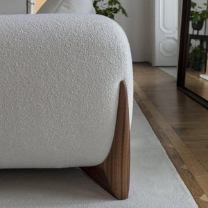 The Amalia Sofa stands as a refined and sophisticated centrepiece, ideal for modern lounging areas. This sofa is elevated by uniquely shaped feet crafted from solid ash or walnut wood, which extend partially up, seamlessly integrating into the low, rounded back and armrests.