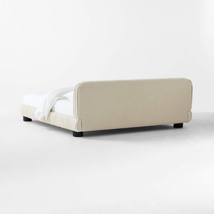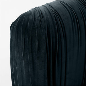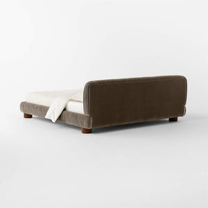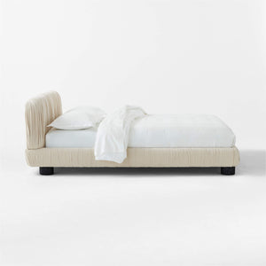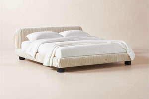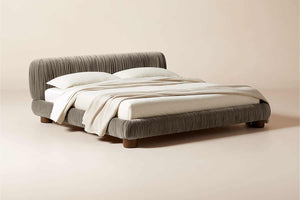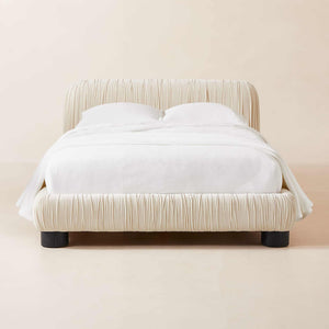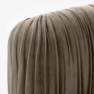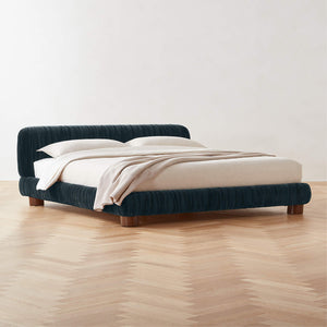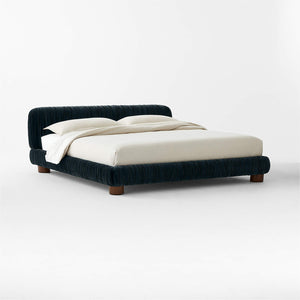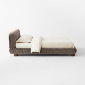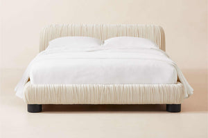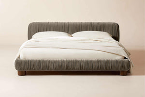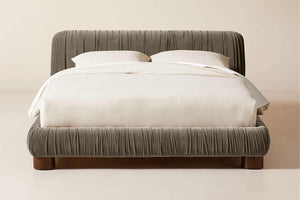 The Filizzola bed, transforms the bedroom with its rich textures and modern appeal. Fully wrapped in sumptuous ruched velvet (other fabrics available), the headboard, footboard, and rails exude a sense of luxury and craftsmanship. Solid cylindrical legs, made from sustainably sourced solid wood, ground the design in contemporary style, blending sophistication with practicality.