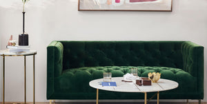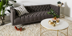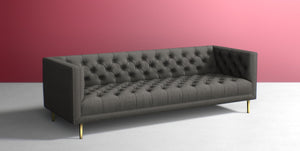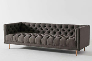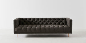 Combining a mid-century shape with all-over buttoning, minimal legs, and a squared frame, this living room centrepiece effortlessly blends stately elegance with a modern aesthetic.