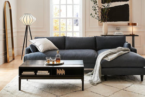 Experience the epitome of modern minimalist decor with the Hudson chaise sofa. Its t-shaped deep and luxuriously comfortable seat and back cushions create a relaxing respite that effortlessly complements contemporary living spaces with a mid century feel.